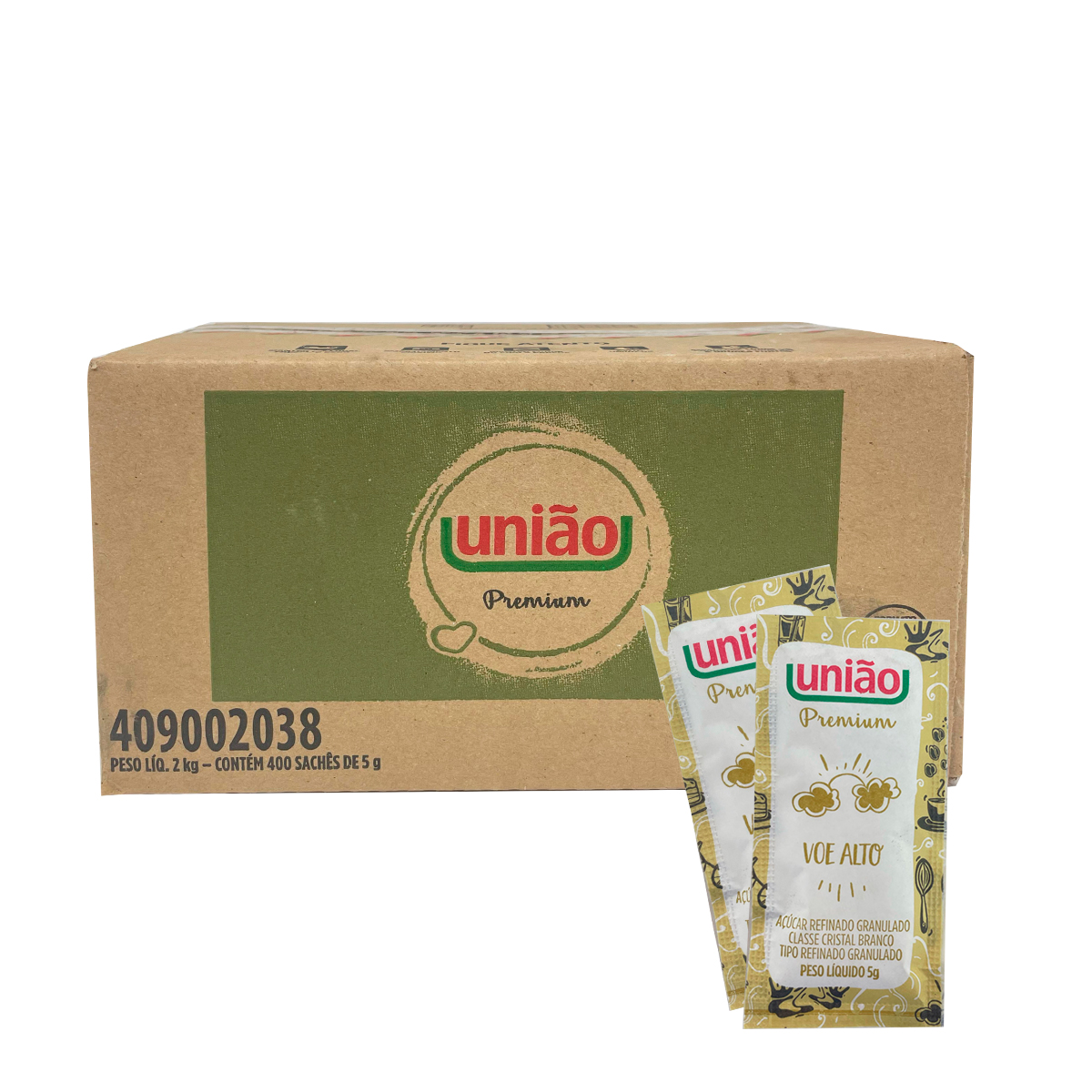 O Açúcar Premium União apresenta grãos menores e mais uniformes, conferindo uma aparência nobre e cristalina, semelhante a pequenos diamantes | Sua formulação especial absorve menos umidade, mantendo o açúcar soltinho por muito mais tempo, ideal para adoçar bebidas e preparações com praticidade e qualidade | Especificações: conteúdo: 400 sachês de papel | peso unitário: 5g por sachê | tipo: açúcar premium com alta pureza | embalagem prática para uso individual | tamanho do sachê: 8 x 3,5 cm | tamanho da caixa: 13 x 24 x 20 cm | Perfeito para uso em restaurantes, cafés, hotéis, escritórios e eventos que buscam excelência no atendimento e na apresentação | Código: -778