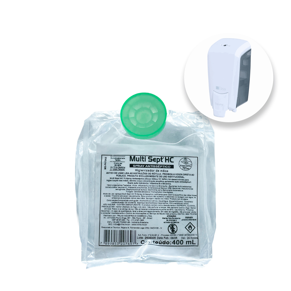 Álcool Spray para Mãos 70% INPM 400 mL – Multi Sept (Exaccta) | Solução prática e eficaz para higienização das mãos, ideal para ambientes com controle rigoroso de contaminação | Álcool etílico 70% INPM com tempo de ação prolongado para desinfecção eficiente | Enriquecido com glicerina e vitamina E para hidratação e proteção da pele mesmo com uso frequente | Elimina 99,99% dos microrganismos testados, incluindo bactérias multirresistentes (Acinetobacter baumannii, Klebsiella pneumoniae KPC, Enterococcus faecium VRE, Staphylococcus aureus MRSA), bactérias comuns em ambientes médicos (Pseudomonas aeruginosa, S. aureus, Escherichia coli, Salmonella choleraesuis), vírus (Influenza A, Bronquite) e fungos (Candida albicans, Aspergillus brasiliensis, Trichophyton interdigitale) | Dermatologicamente testado e seguro para uso frequente | Sistema sustentável e econômico “Eco Fácil” com refil de 400 mL compatível com saboneteiras Exaccta ou Elisa | Válvula spray que libera 0,4 mL por acionamento, garantindo rendimento até 3 vezes maior que sistemas convencionais | Indicado para clínicas, hospitais, laboratórios, restaurantes, cozinhas industriais, indústrias alimentícias, academias, hotéis, creches e escritórios | Dimensões da embalagem: 12 x 9,5 x 5 cm | Multi Sept Spray – eficiência, cuidado e sustentabilidade para proteção diária das mãos. | Código: -6576