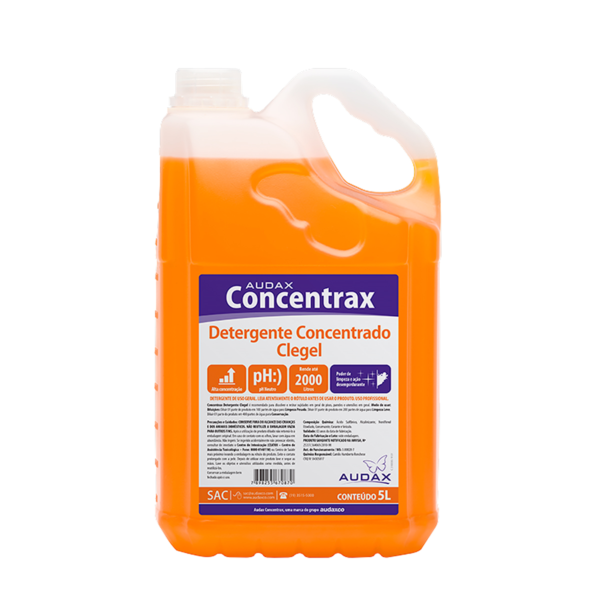 Detergente Clegel Concentrax 5L Audax | Limpeza Profunda e Desengordurante | O Detergente Clegel Concentrax 5L Audax é um produto concentrado de alta performance, desenvolvido para limpeza pesada e manutenção diária. Com poder desengordurante, elimina com facilidade gorduras animais, vegetais e minerais, garantindo superfícies limpas e seguras sem agredir o ambiente ou utensílios. | Ideal para cozinhas domésticas e comerciais, copas, louças, utensílios, pisos e azulejos, o produto combina eficiência e economia, proporcionando alto rendimento com pH neutro. | Especificações do Produto: | Marca: Audax | Conteúdo: 5 litros | Tamanho da embalagem: 31 x 17 x 12 cm | Fragrância: Característica | Cor: Laranja | Diluição: Limpeza pesada: 1:100 | Limpeza leve: 1:200 | Manutenção: 1:400 | Embalagem: 1 galão de 5 litros | Caixa de embarque: 2x5 litros | Benefícios: | Limpeza profunda de gorduras e óleos | Produto concentrado, econômico e de alto rendimento | pH neutro: seguro para superfícies laváveis | Ideal para uso doméstico e profissional | Versátil: pode ser usado em louças, utensílios, pisos e azulejos | Com o Detergente Clegel Concentrax 5L Audax, você garante limpeza eficiente, superfícies livres de gordura e economia, tudo com praticidade em um único produto. | Código: -9429