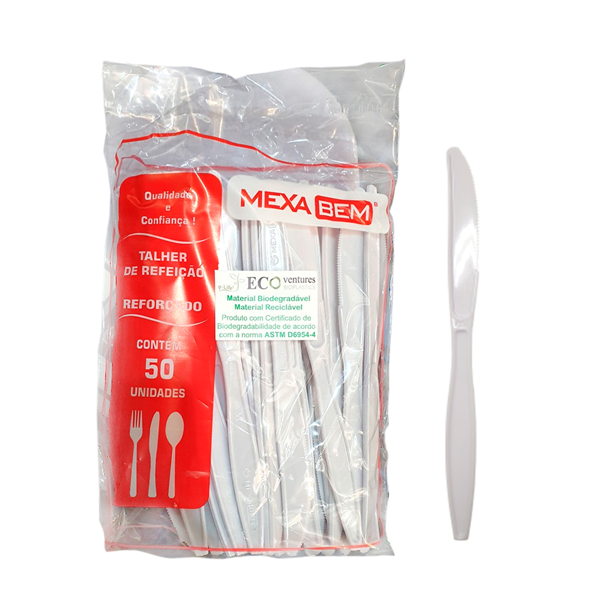 A linha Master Reforçada da Mexa Bem foi projetada para oferecer resistência superior no uso diário, sem abrir mão da economia. Ideal para alimentos quentes ou frios, a faca é fabricada com poliestireno cristal atóxico, proporcionando segurança alimentar, durabilidade e praticidade em todas as ocasiões. Além de ser reutilizável, este produto faz parte da linha biodegradável da marca, com certificação internacional ASTM D6954-4, que assegura sua decomposição ambientalmente segura. Indicado para: restaurantes, lanchonetes, cafeterias, food trucks, escolas, hospitais, empresas, eventos, buffets, delivery, festas e uso doméstico sustentável | Estrutura reforçada – não quebra com facilidade | Pode ser lavada e reutilizada sem deformar | Produto certificado como biodegradável (ASTM D6954-4) | Fabricado com plástico atóxico, seguro para alimentos | Mais durabilidade com menor impacto ambiental | Modelo: Faca Master Reforçada Biodegradável | Comprimento: 18 cm | Cor: Branco | Linha: Biodegradável Mexa Bem | Composição: Poliestireno cristal + pigmento atóxico | Certificação: ASTM D6954-4 | Reciclável: Sim | Biodegradável: Sim | Embalagem: Pacote com 50 unidades | Tamanho do pacote: 26 cm x 15 cm x 2,5 cm. | código: 7940